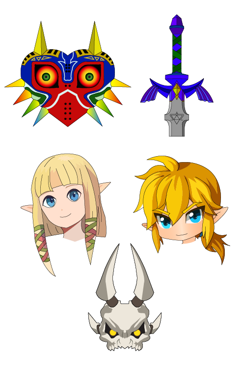 This project was creating emojis. My theme of the emojis was the video game series of Legend of Zelda. I created five emojis. The first emoji is a mask that one of the characters wears in a game. The next emoji is an item that the main protagonist holds. The last three are the main characters: the princess, the hero, and the villain.